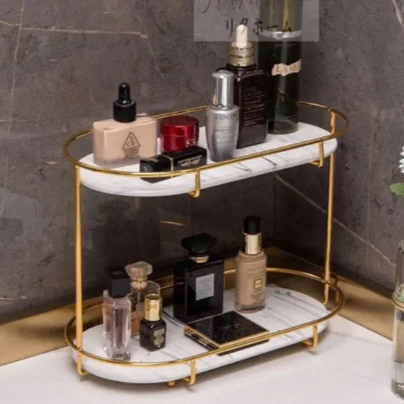 Keep your space organized and stylish with this 2-tier oval shaped rack stand. Its elegant design is perfect for storing makeup, skincare, perfumes, jewelry, or even serving snacks and drinks. Ideal for vanity tables, bathrooms, kitchens, or as a decorative centerpiece.