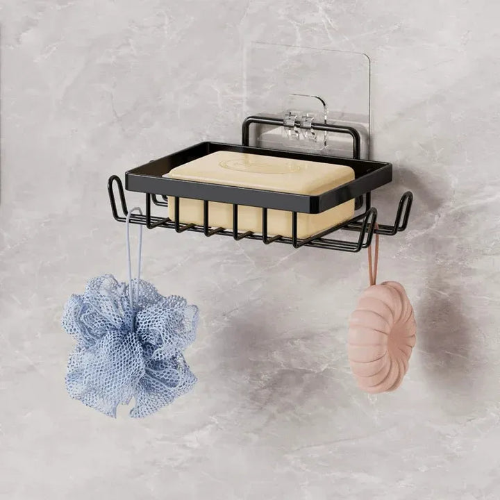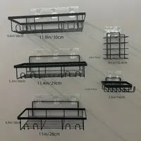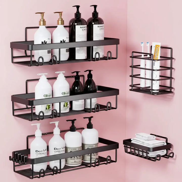 - 5-in-1 complete set: 2 shower shelves, 2 soap holders, 1 toothbrush/razor holder + strong traceless adhesives for each piece.