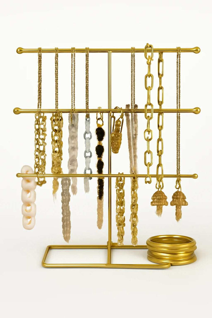 A stylish and practical way to organize your favorite bangles, bracelets, and necklaces. The Elegant Jewelry Stand brings charm to any dressing table with its sleek design. Whether you're displaying your daily essentials or storing precious pieces, this stand keeps your jewelry tangle-free and beautifully presented. A thoughtful gift for her or a must-have for your own collection.