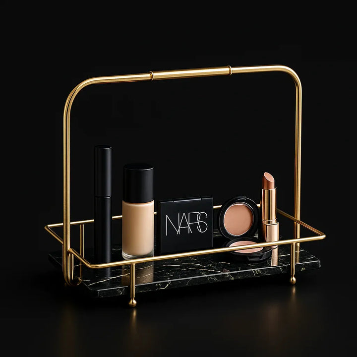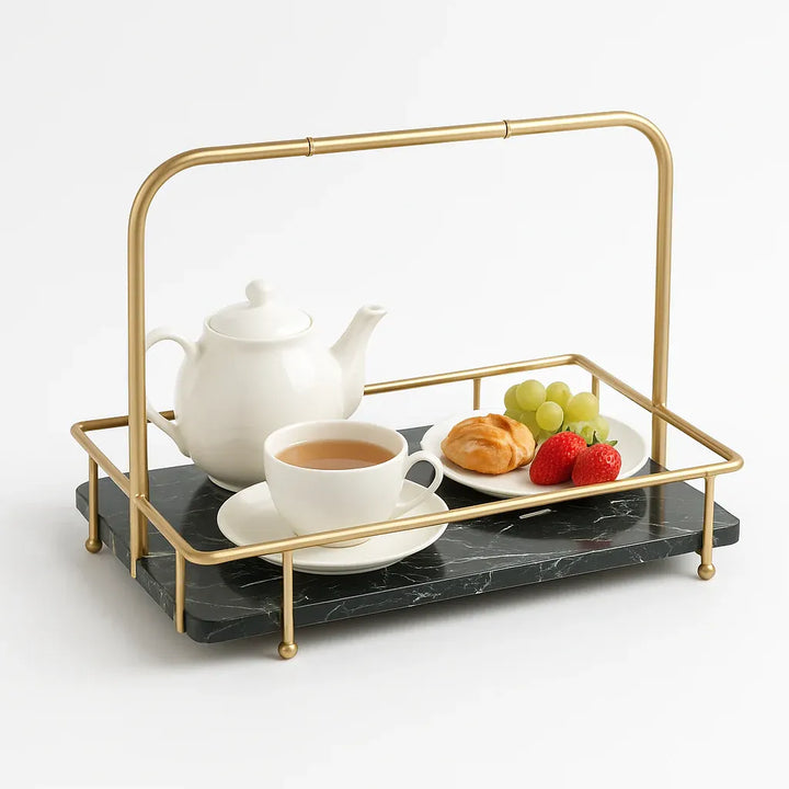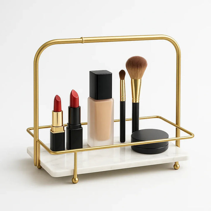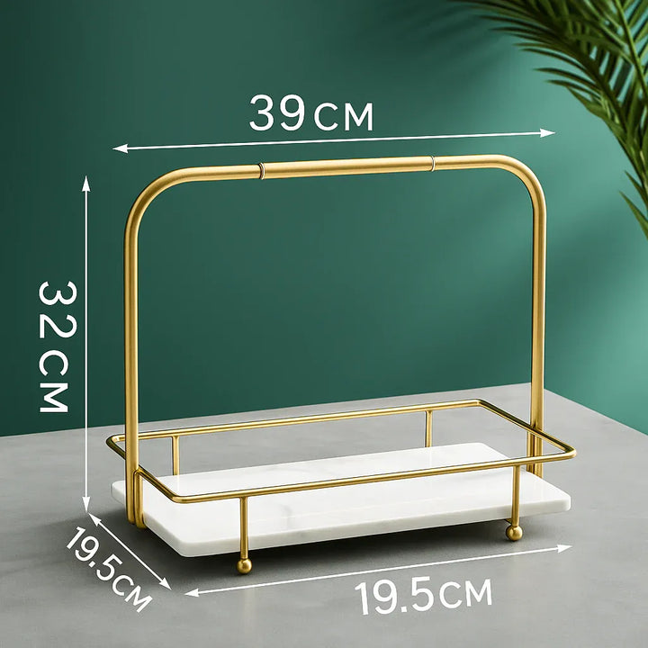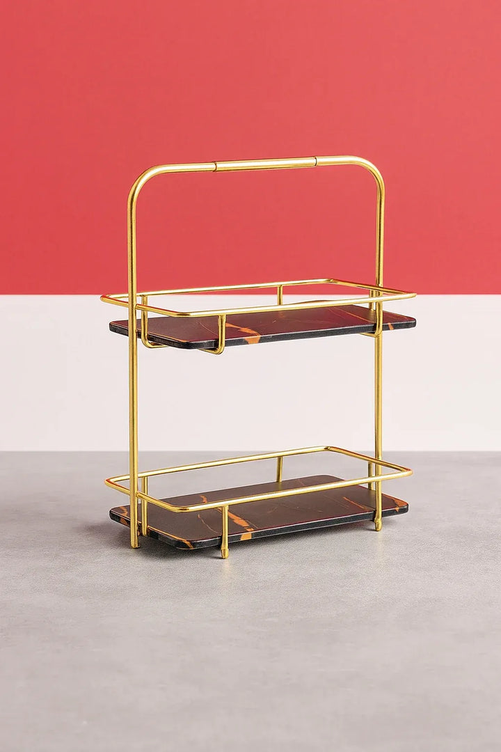 Add a touch of luxury to your space with this gold and marble 2-tier multipurpose storage rack. Designed with a sleek gold frame and elegant marble-style shelves, it’s perfect for organizing makeup, skincare, perfumes, jewelry, snacks, or decorative items.