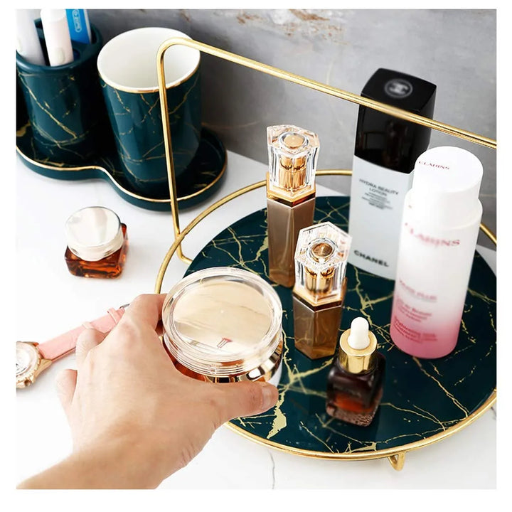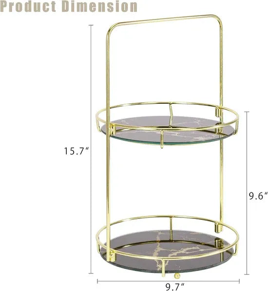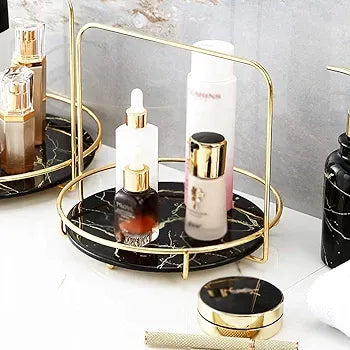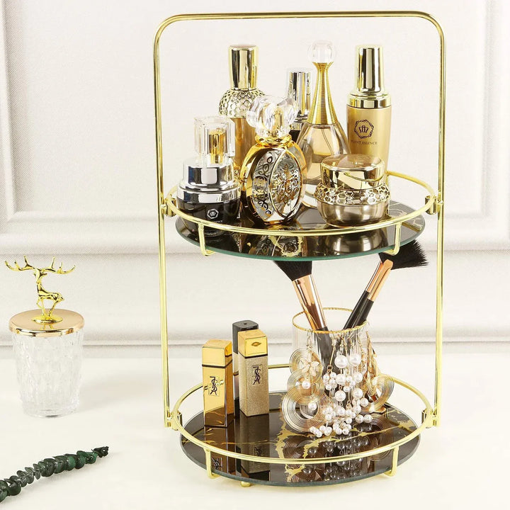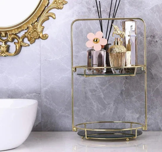 Keep your dresser or countertop neat and stylish with this round wire vanity organizer rack. Designed with a chic gold frame and three spacious tiers, it’s perfect for holding makeup, perfumes, jewelry, skincare, or decorative accents. Its versatile design makes it equally useful in the bathroom, kitchen, or living area.