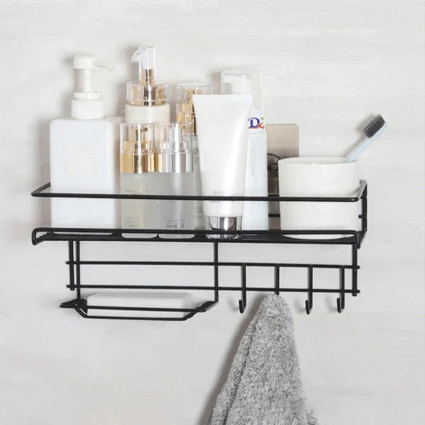 Wall-Mounted Bathroom Shelf with Hooks & Soap Holder — No-Drill, Adhesive Install